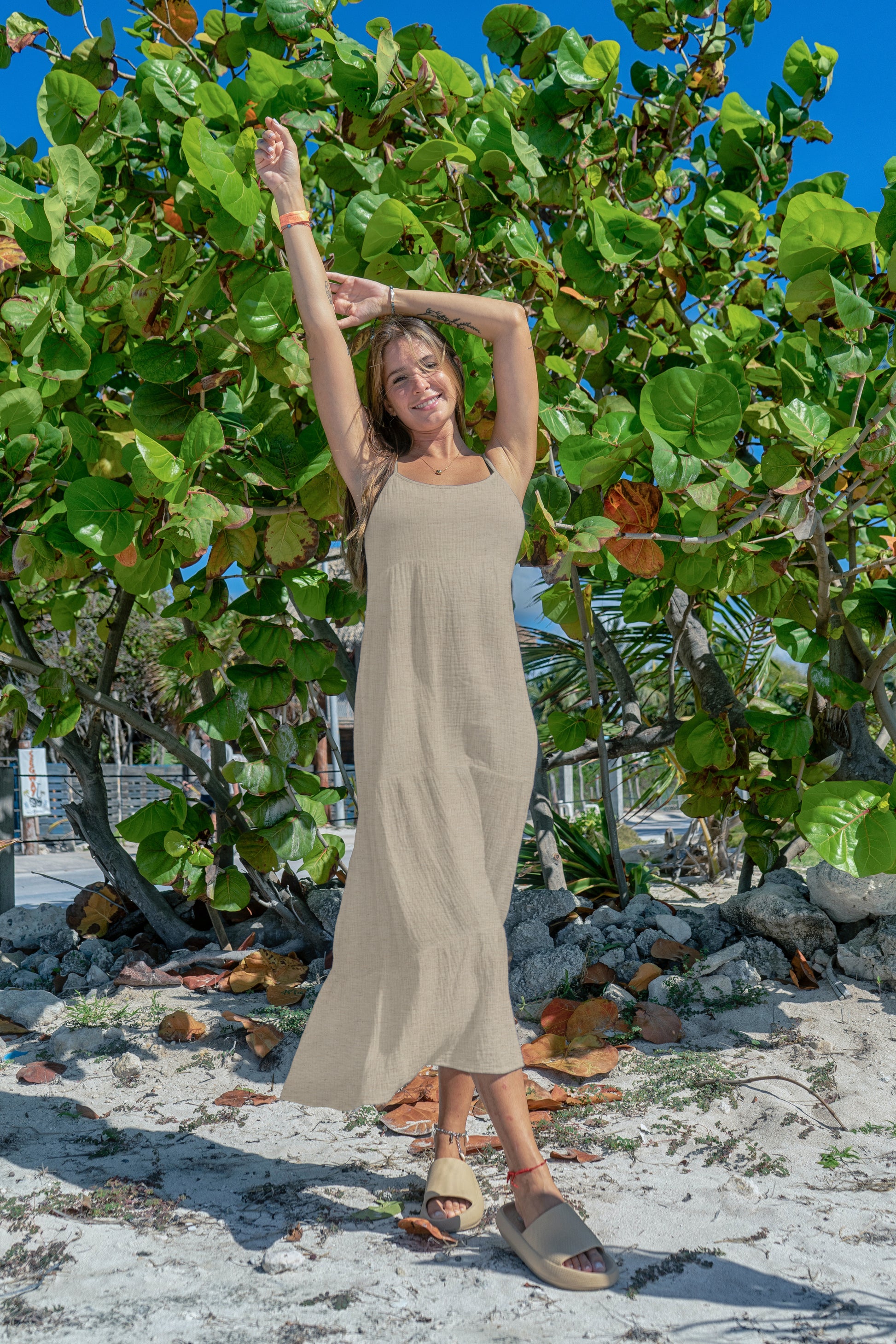 Deze double gauze-stof combineert een luchtige, zachte touch met een natuurlijke linen-kleur. Dankzij de mix van 83% katoen en 17% linnen voelt de stof licht en ademend aan, behoudt ze haar vorm en biedt ze een zachte textuur voor optimaal draagcomfort.